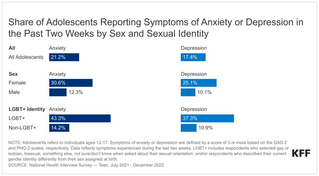 Data from the recently released Teen National Health Interview Survey from July 2021 to December 2022, reveals that 21% of adolescents ages 12-17 report experiencing symptoms of anxiety in the past two weeks, and 17% said they had symptoms of depression.